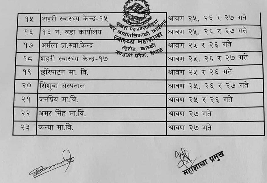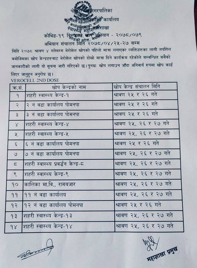 पहिलो खोप लगाएर दोस्रो खोप लगाउन बाँकी रहेका व्यक्तिहरुलाई निम्न स्थानमा गएर खोप लगाउन पोखरा महानगपालिकाले सुचना जारी गरेको छ ।